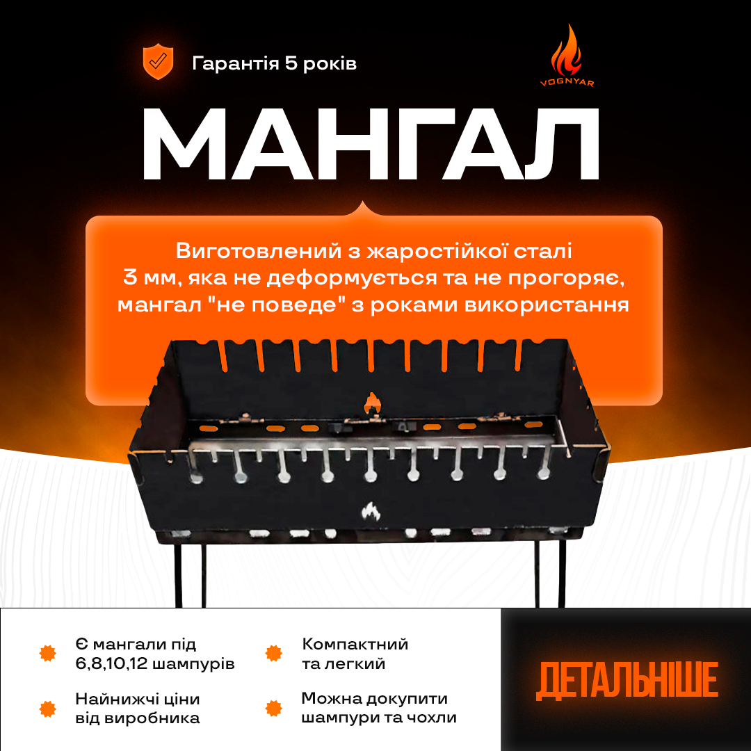 Мангал розкладається всього за 2 хвилини, Вся конструкція дуже проста і надійна. Гарантія на мангал 5 роки.
